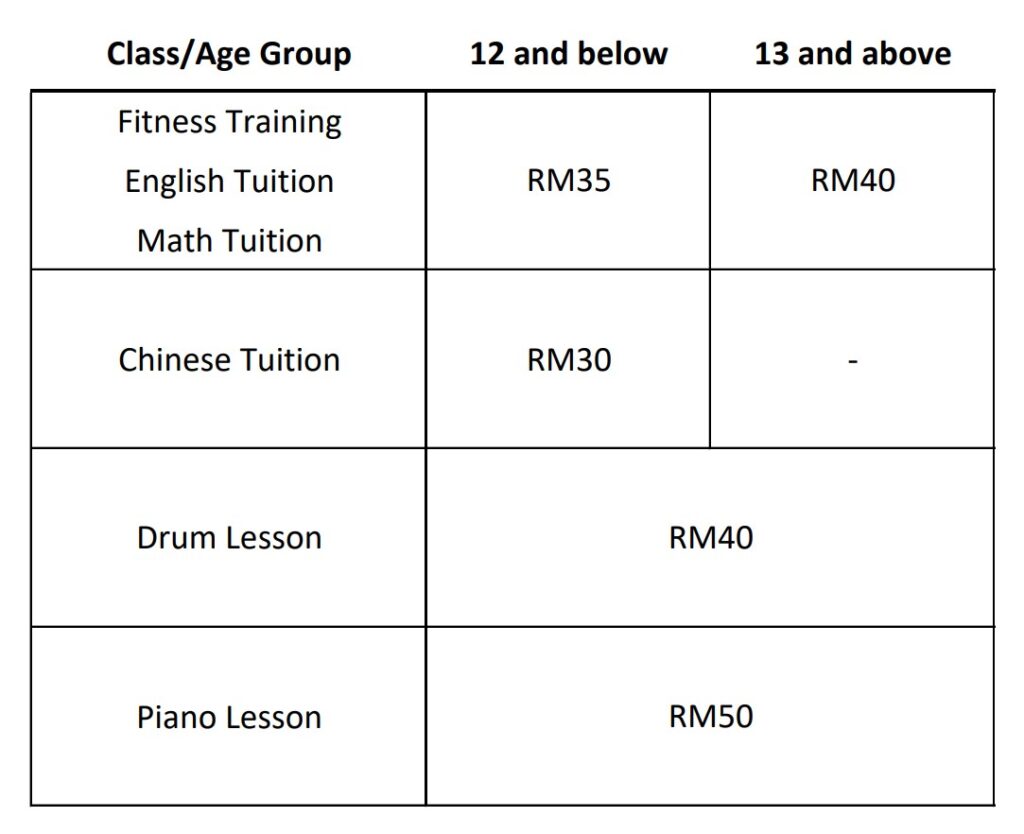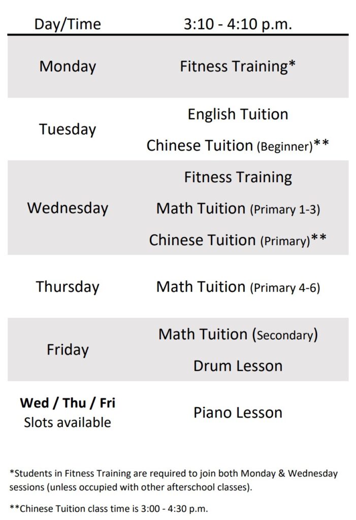 Note: Students in Fitness Training are required to join both Monday & Wednesday sessions (except Juniors who are in Chinese Tuition). This is to ensure students have better results and improvement.
